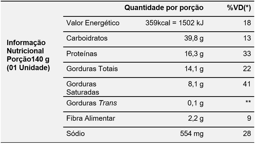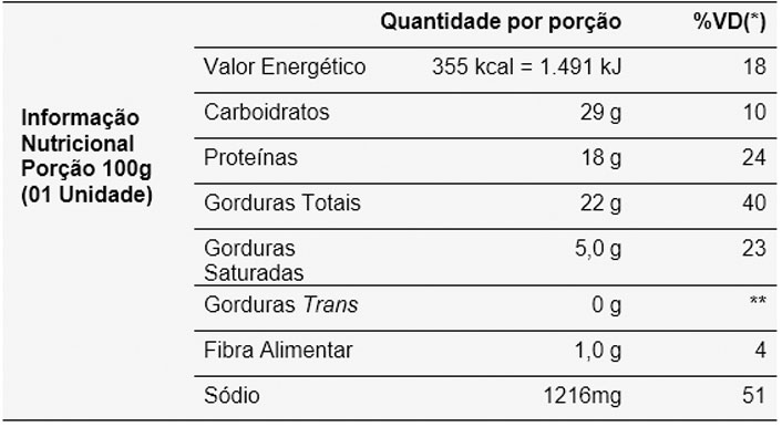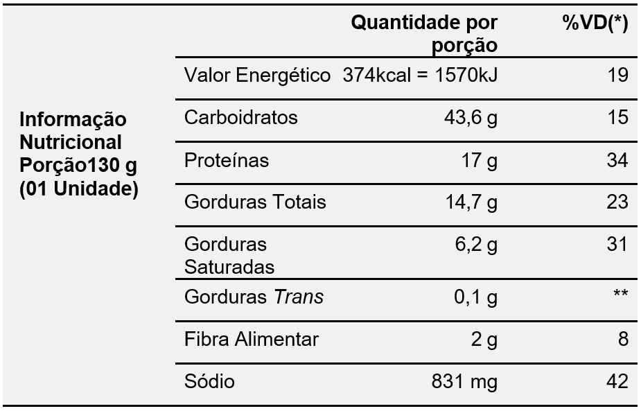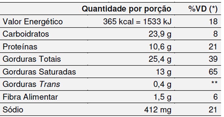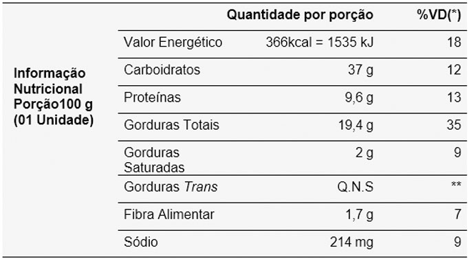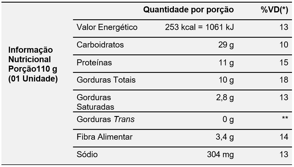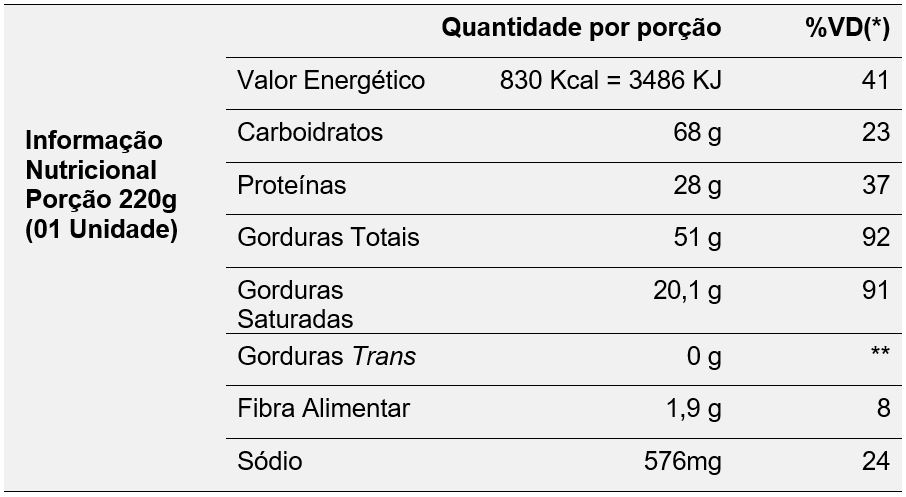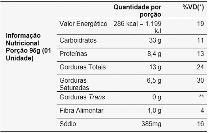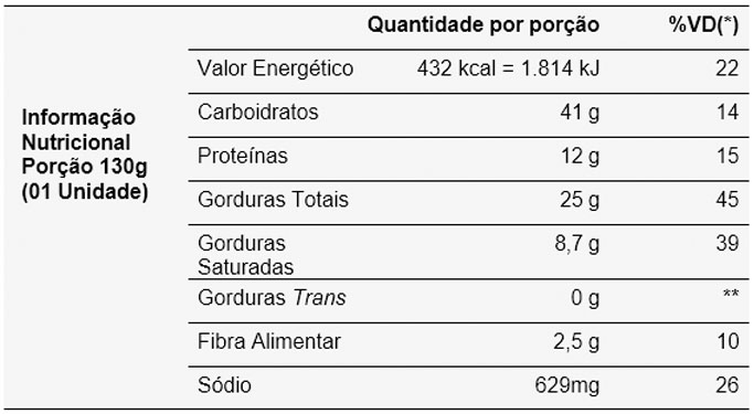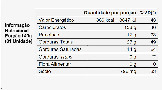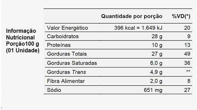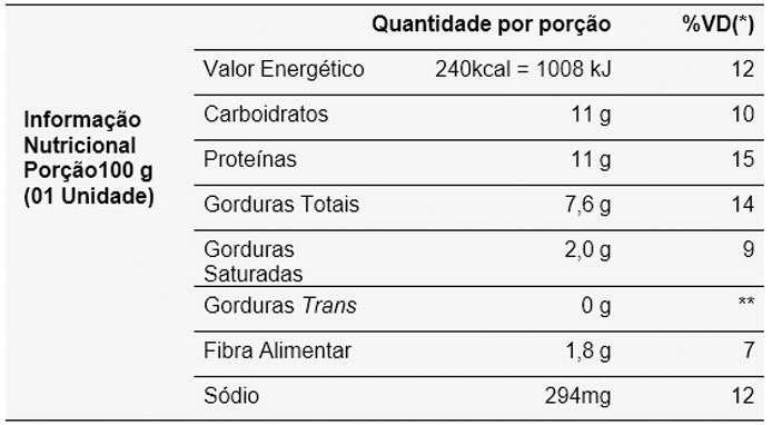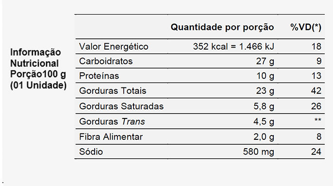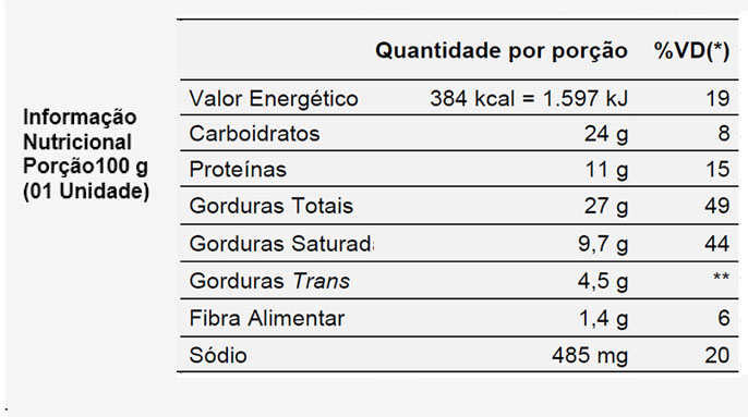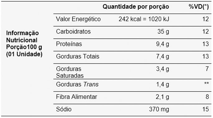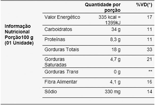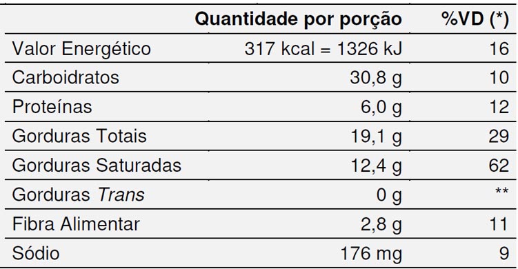 *Valores diários com base em uma dieta de 2.000 kcal ou 8.400 kJ. Seus valores diários podem ser maiores ou menores dependendo de suas necessidades energéticas. ** VD não estabelecido.