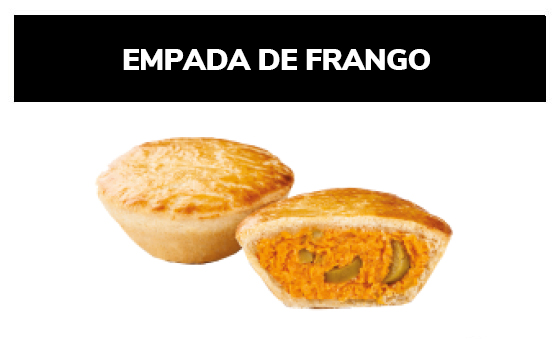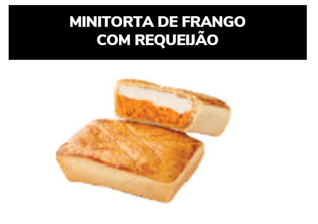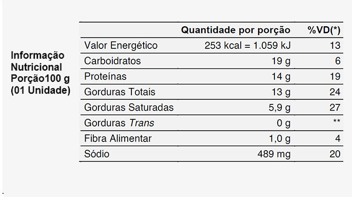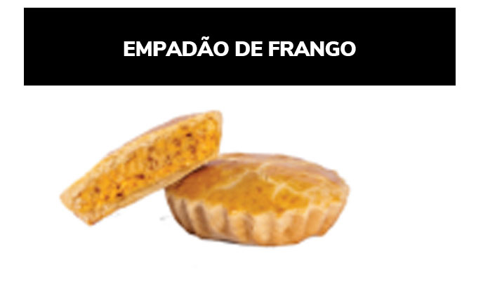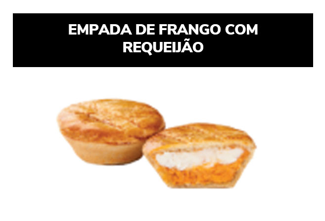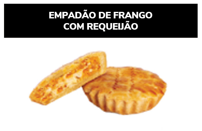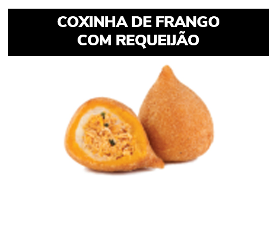 Ingredientes: Farinha de trigo enriquecida com ferro e ácido fólico, margarina, requeijão, gordura animal, frango, ovo, proteína vegetal, sal, composto lácteo, óleo de soja, alho, caldo de galinha, colorau, cebolinha, realçador de sabor, pimenta, vinagre, azeite, cebola e pimenta. CONTÉM GLÚTEN. ALÉRGICOS: CONTÉM OVO E DERIVADOS DE TRIGO, LEITE, SOJA E CEVADA. PODE CONTER CENTEIO, AVEIA, PEIXE E CRUSTÁCEO (CAMARÃO, LAGOSTA E CARANGUEJO).